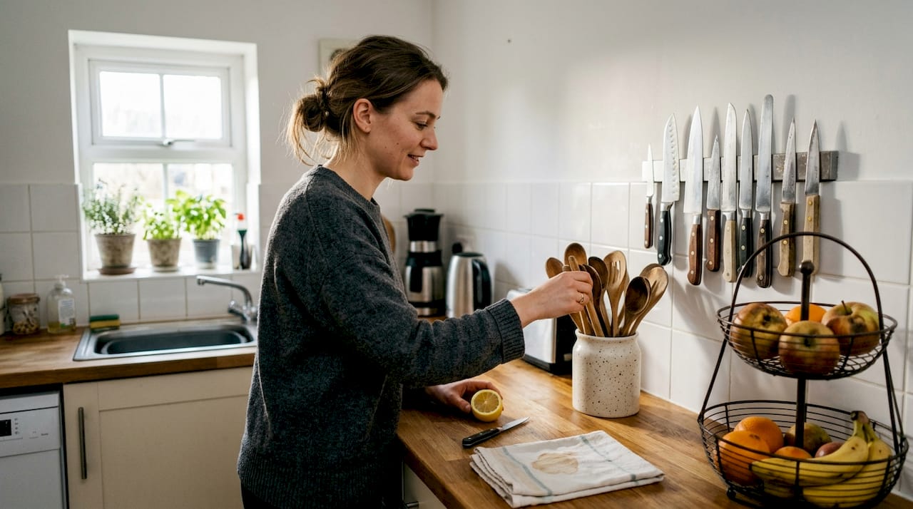 Kitchen: Start with countertop organisation. A stylish utensil holder, a wall-mounted magnetic knife strip, and a tiered fruit stand all reduce clutter while keeping essentials within reach. Choose materials like stainless steel or sealed wood that are easy to wipe down.