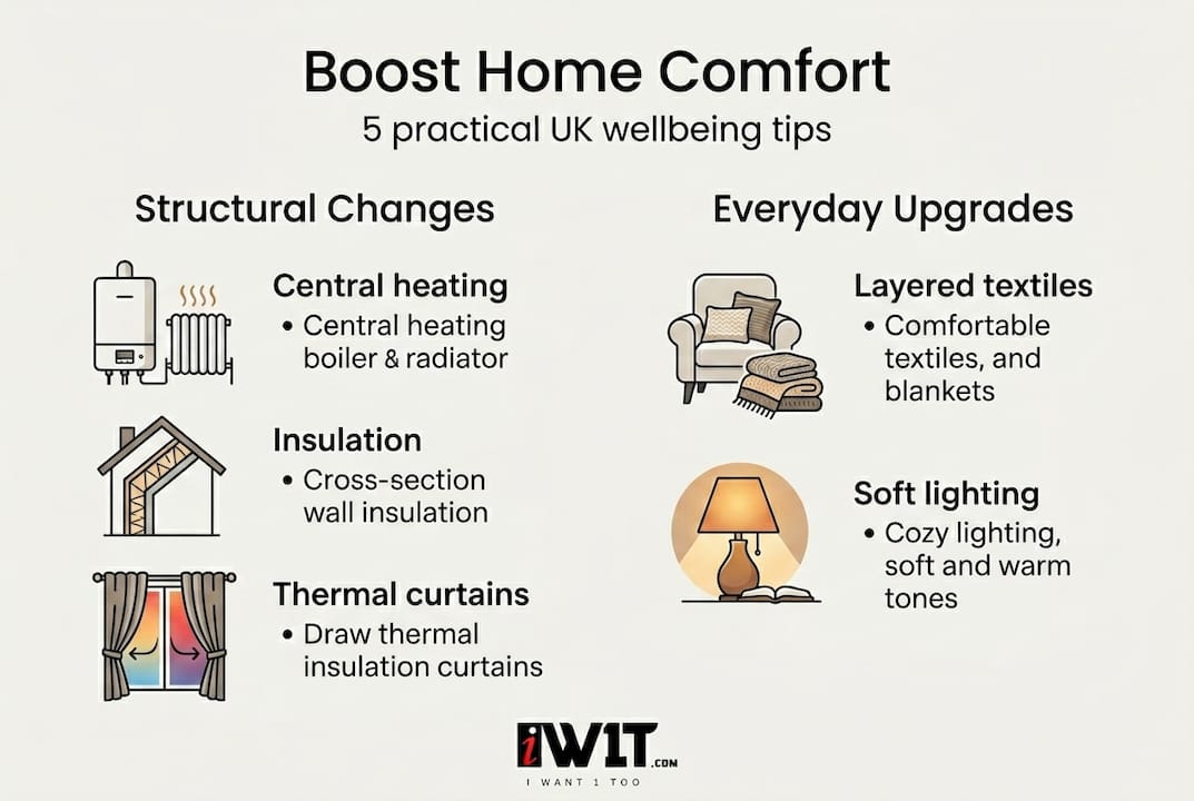 Layered textiles, warm-toned lighting, draught excluders, and affordable comfort hacks like peel-and-stick decor deliver immediate improvement for under £30. Focus on your bedroom first for the fastest impact on sleep and mood.