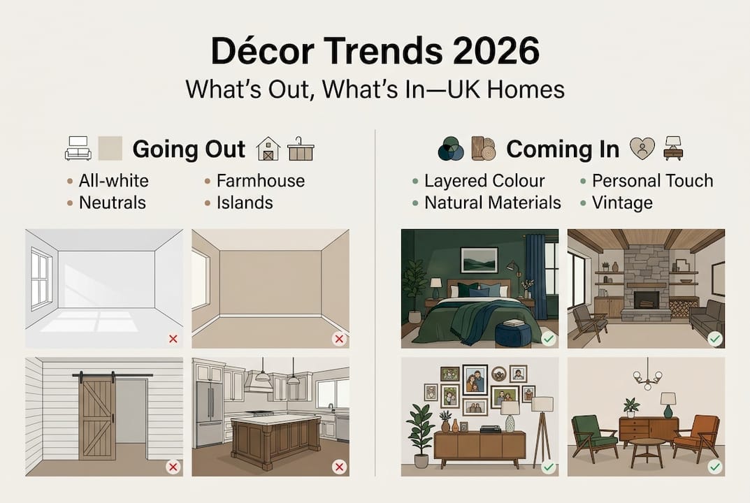 all-white kitchens, the modern farmhouse look, all-neutral rooms, and waterfall islands, replaced by layered colour palettes, mixed wood tones, and rooms that tell a story rather than present a blank canvas.| Going out in 2026 | Coming in for 2026 |